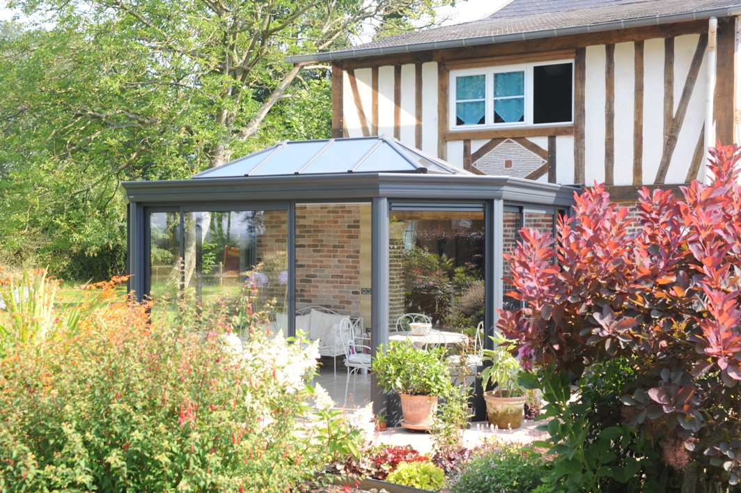 Très beau VÉRANDÔME à pans coupés de VERANCO offrant aux propriétaires, dans un espace de vie lumineux, le loisir de se ressourcer dans l’immersion de leur jardin luxuriant.